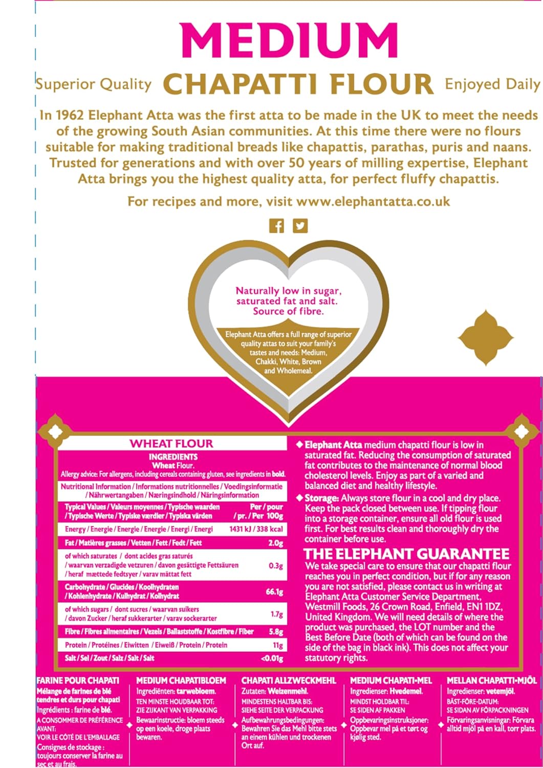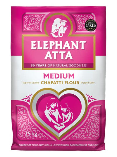 Elephant Medium Flour (Atta) delivers the best of both worlds – taste and nutrition. We have blended our wholemeal flour with our soft white flour to achieve the perfect blend that makes light and fluffy chapattis packed full of taste and nutrients. Elephant Atta Medium is the nation’s favourite atta and has been awarded 2 gold stars at the ‘Great Taste Awards 2017.